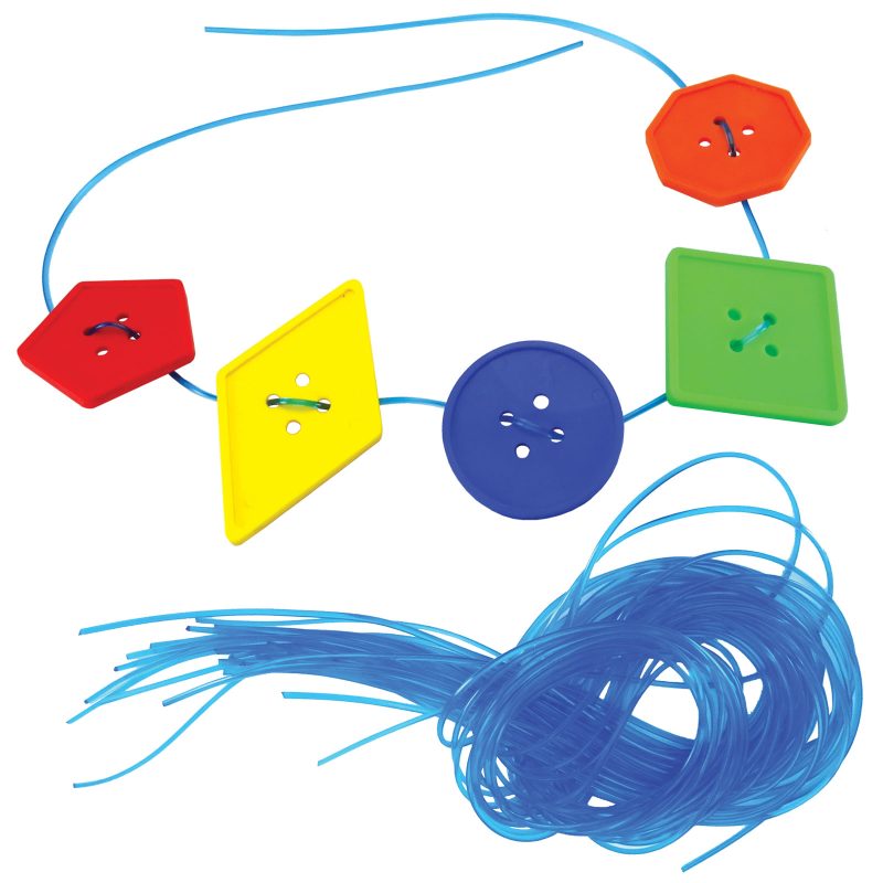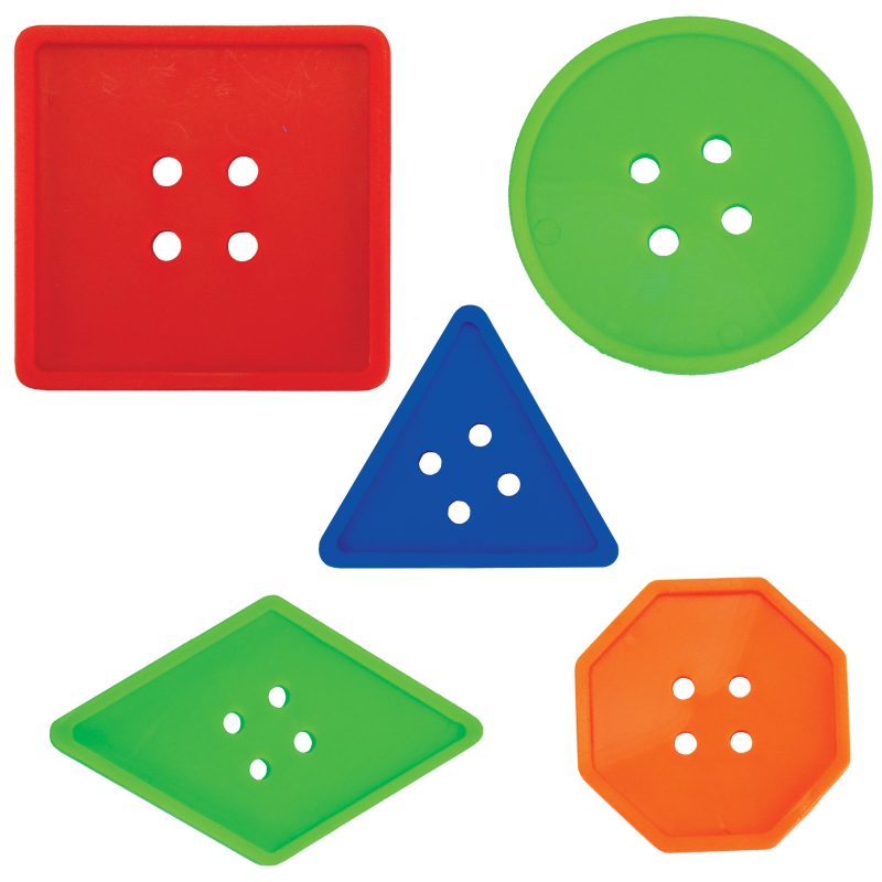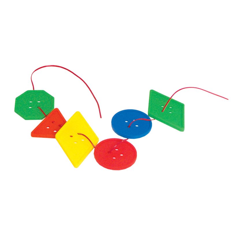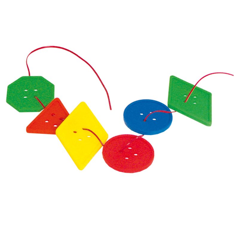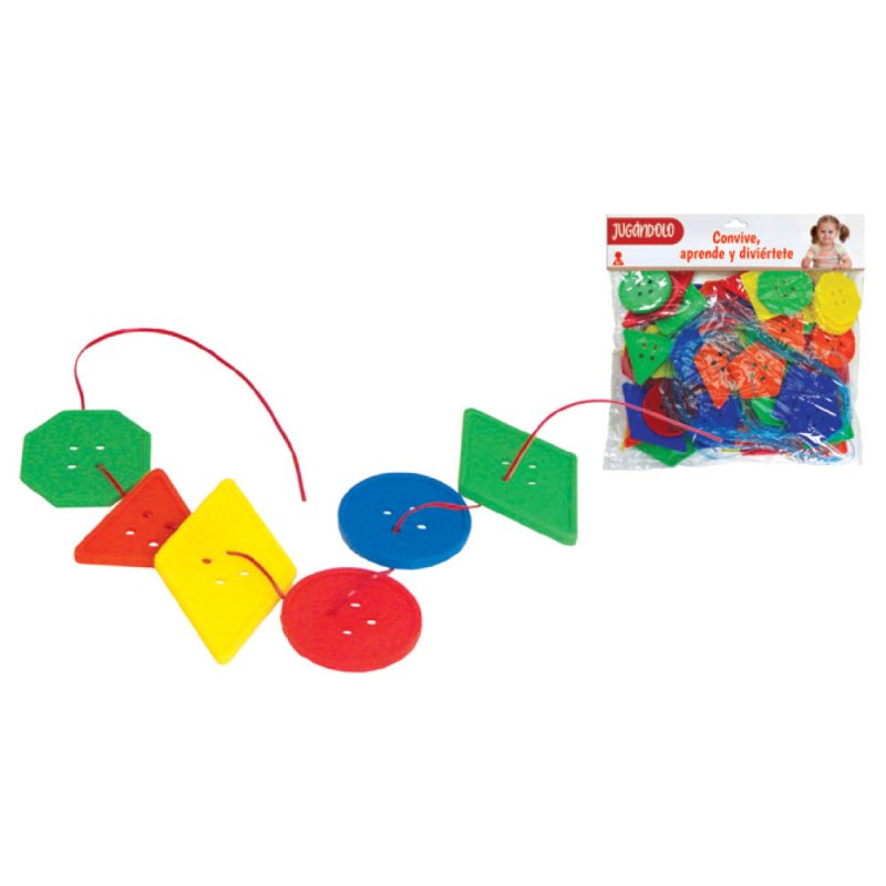 Pentágonos, hexágonos, cuadrados, círculos y rombos en 5 colores diferentes que permiten realizar secuencias al momento de ejercitarse ensartándolas. Paralelamente el niño identifica colores y se familiariza con las figuras geométricas.