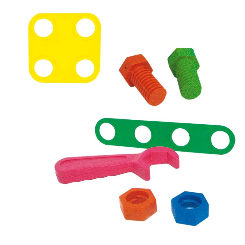 Mecano con piezas grandes en plástico 100% seguras y atractivas para los pequeños, con tuercas, tornillos y soleras para armar infinidad de formas y diseños. Auxiliar en el desarrollo psicomotor y de la inteligencia de los niños.