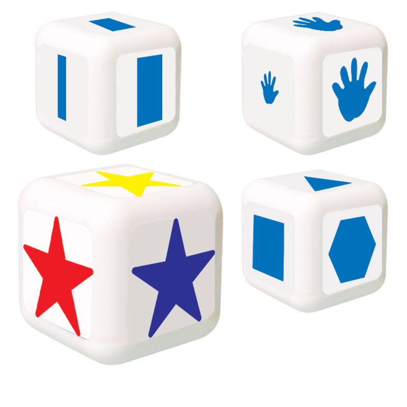 Los dados nos indican si se coloca o retira una pieza de los “Bloques Lógicos” con determinado espesor, tamaño, color o forma, enriqueciendo de esta manera la dinámica de este material.