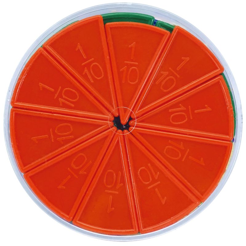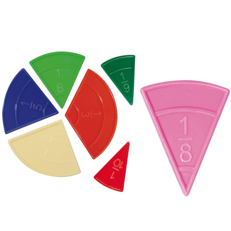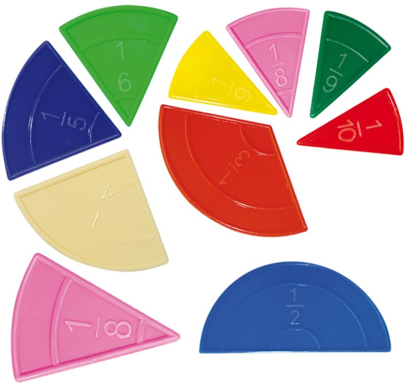Fracciones separadas por color, que permiten realizar operaciones de suma, resta, multiplicación y división de fracciones, desarrolla cálculos de inclinación con la geometría de éstas, auxiliado de un transportador.