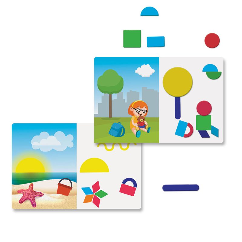 Mediante diversas piezas de forma geométrica el niño desarrollará, al colocarlas en sus tableros, la imaginación y la ubicación espacial