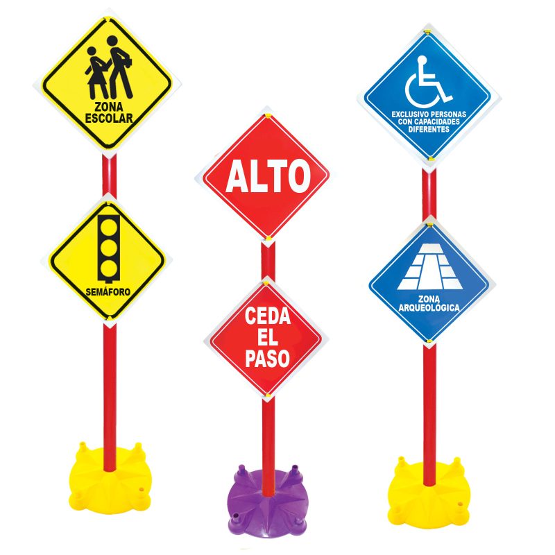 Este juego de señales con bases plásticas permite colocar las señales en diferentes lugares, apoyadas en su pedestal, adecuado para educación vial y lugares donde su señalización sea momentánea. Todo el conjunto es desarmable.