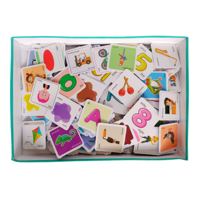 Cartas impresas a todo color que ayudan a desarrollar la inteligencia en los niños, además de enriquecer su vocabulario en el idioma español e inglés y fortalecer su destreza motora e intelectual. Presentación: 260 piezas de 13 temas diferentes (español-inglés) Nivel: Preescolar – Primaria.