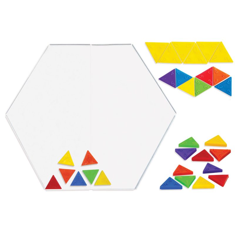 Presentación: Instructivo de uso, una base hexagonal y 24 figuras triangulares en 6 colores diferentes.