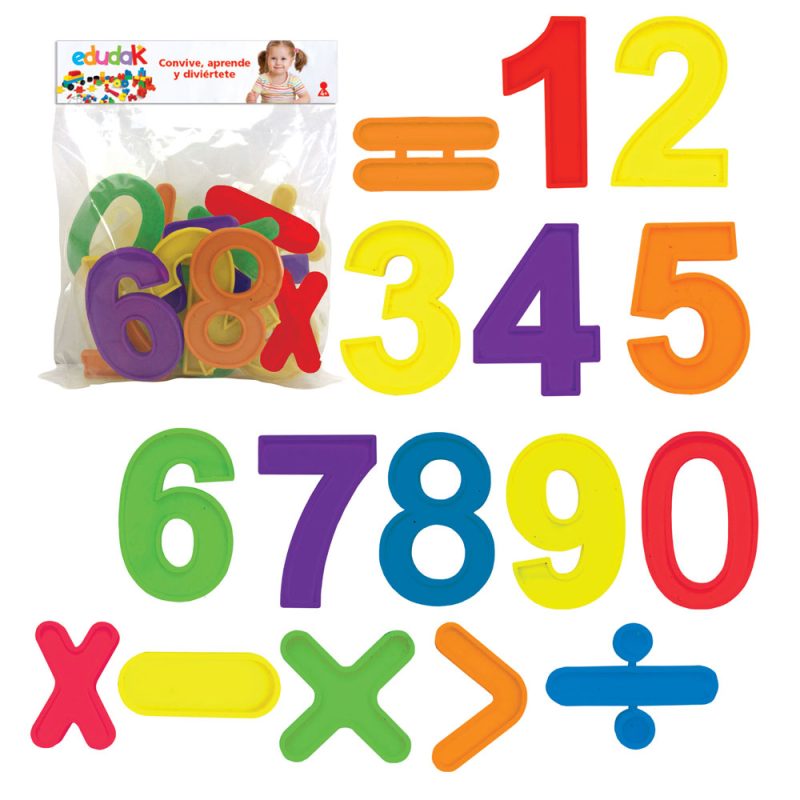 Presentación: 2 juegos de números del 0 al 9 (20 números) y 2 juegos del signos de igual, sumas, restas, multiplicación, división, y mayor o menor que (12 signos).