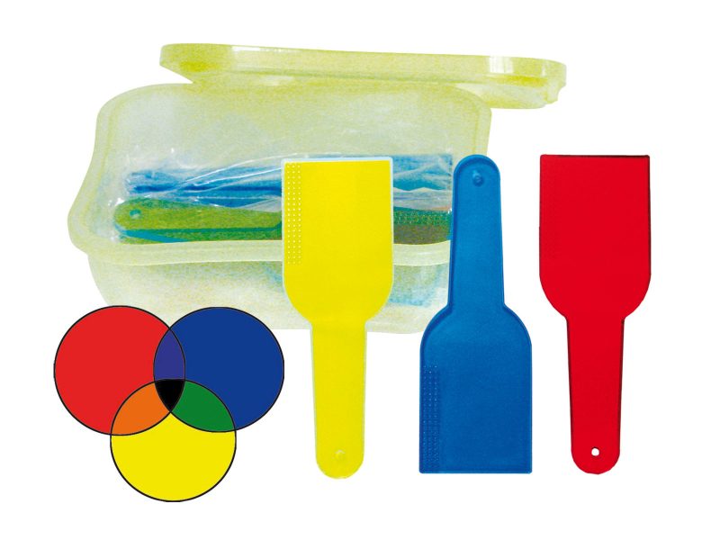 Este material apoya la enseñanza de los colores permitiendo, en base a los colores primarios y su superposición, obtener una gama de colores secundarios.