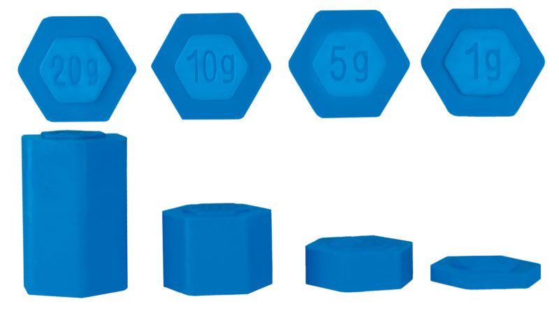 Juego de pesas para balanza romana o de líquidos. Permite ejercitar operaciones básicas, equivalencias y fracciones.