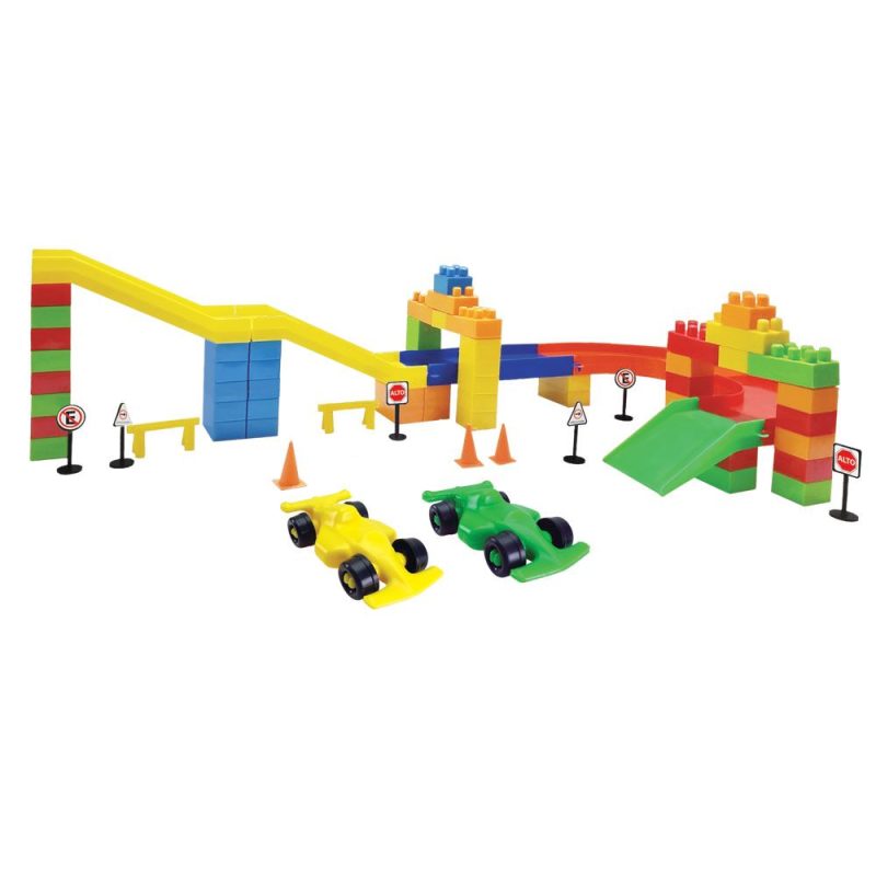 Monta fácilmente las pistas y crea un circuito personalizado con rampas, curvas y obstáculos para desafiar a los participantes.