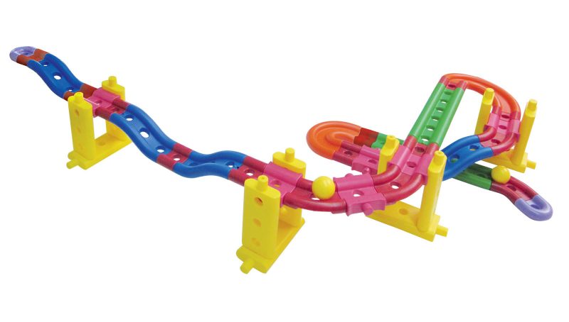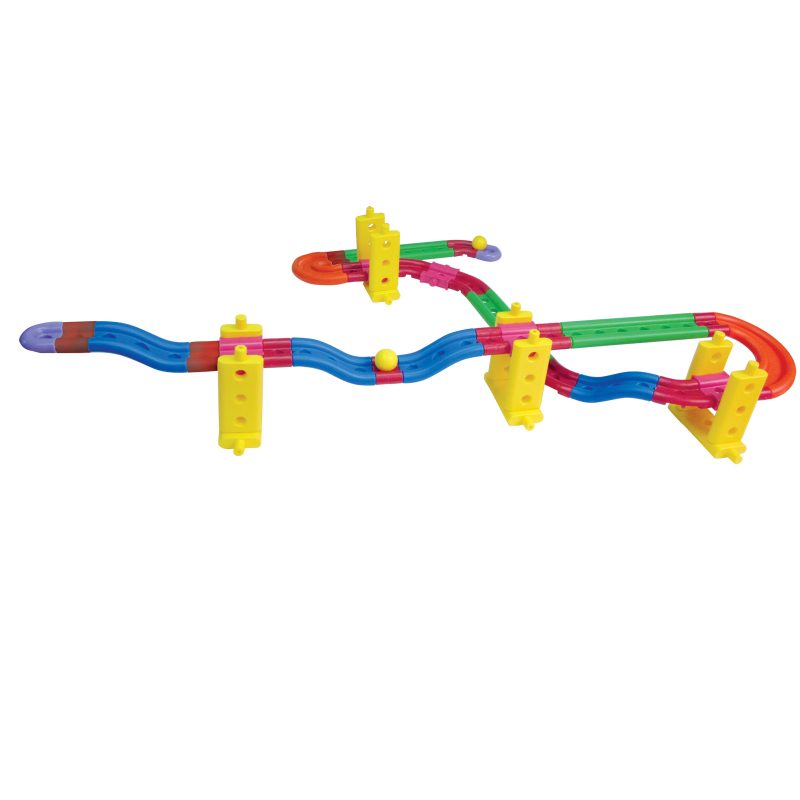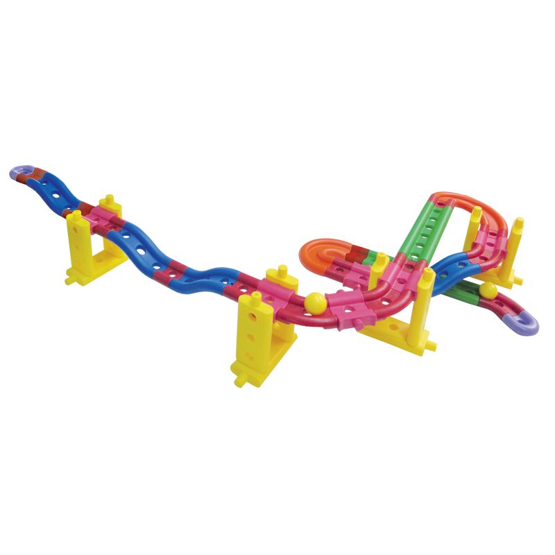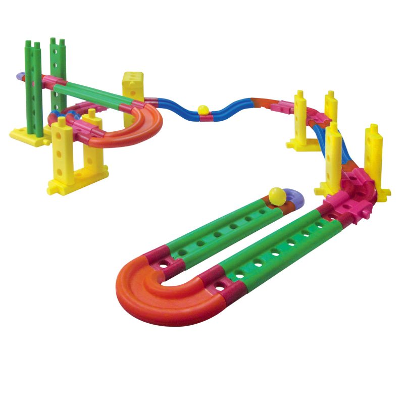 Material de psicomotricidad fina, ubicación espacial, geometría, reconocimiento de formas, etc. Adecuado para el juego en conjunto, se forman diferentes direcciones de una pista recorrida por una esfera que es la parte móvil del juego. Incluye patrones determinados en su instructivo.