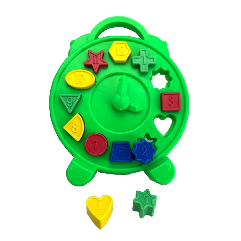 Material introductorio para el juego de reconocimiento en el aprendizaje del tiempo (¿qué hora es?). Cada una de las horas marcadas en el reloj forma parte de una figura geométrica diferente, de tal manera que es un material de autocorrección así como el reconocimiento de forma y color.