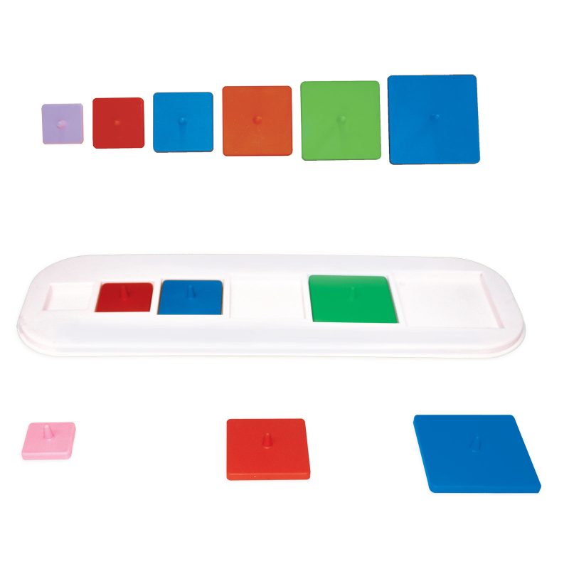 Tablero en el que el alumno coloca en orden creciente o decreciente cuadrados, desarrollando sus habilidades motoras finas, el conocimiento de las figuras y su clasificación.